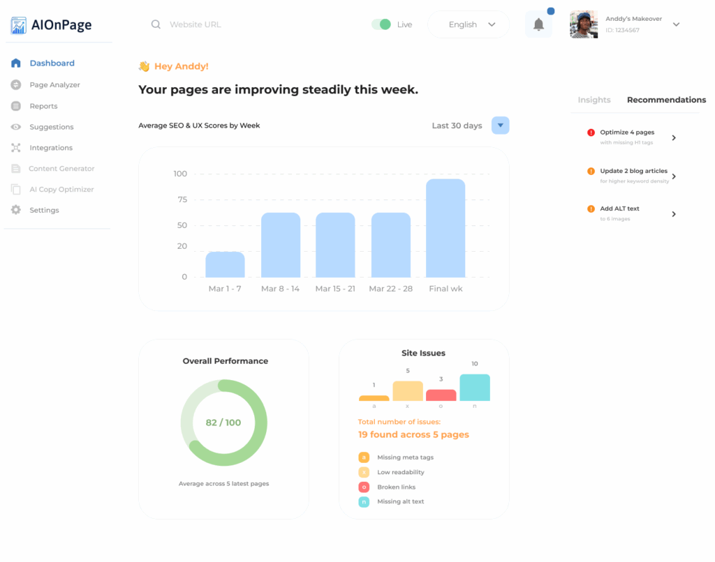 AIOnPage pulls live keyword, traffic, and performance data to generate accurate, data-driven recommendations for higher visibility.